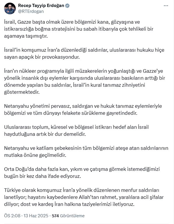 Cumhurbaşkanı Recep Tayyip Erdoğan, yaptığı yazılı açıklamada, “İsrail, Gazze başta olmak üzere bölgemizi kana, gözyaşına ve istikrarsızlığa boğma stratejisini bu sabah itibarıyla çok tehlikeli bir aşamaya taşımıştır. İsrail’in komşumuz İran’a düzenlediği saldırılar, uluslararası hukuku hiçe sayan apaçık bir provokasyondur. İran’ın nükleer programıyla ilgili müzakerelerin yoğunlaştığı ve Gazze’ye yönelik insanlık dışı eylemler karşısında uluslararası baskıların arttığı bir dönemde yapılan bu saldırılar, İsrail’in kural tanımaz zihniyetini göstermektedir. Netanyahu yönetimi pervasız, saldırgan ve hukuk tanımaz eylemleriyle bölgemizi ve tüm dünyayı felakete sürükleme gayretindedir. Uluslararası toplum, küresel ve bölgesel istikrarı hedef alan İsrail haydutluğuna artık bir dur demelidir. Netanyahu ve katliam şebekesinin tüm bölgemizi ateşe atan saldırılarının mutlaka önüne geçilmelidir. Orta Doğu’da daha fazla kan, yıkım ve çatışma görmek istemediğimizi bugün bir kez daha ifade ediyoruz. Türkiye olarak komşumuz İran’a yönelik düzenlenen menfur saldırıları lanetliyor; hayatını kaybedenlere Allah’tan rahmet, yaralılara acil şifalar diliyor; dost ve kardeş İran halkına taziyelerimizi iletiyoruz” ifadelerini kullandı.