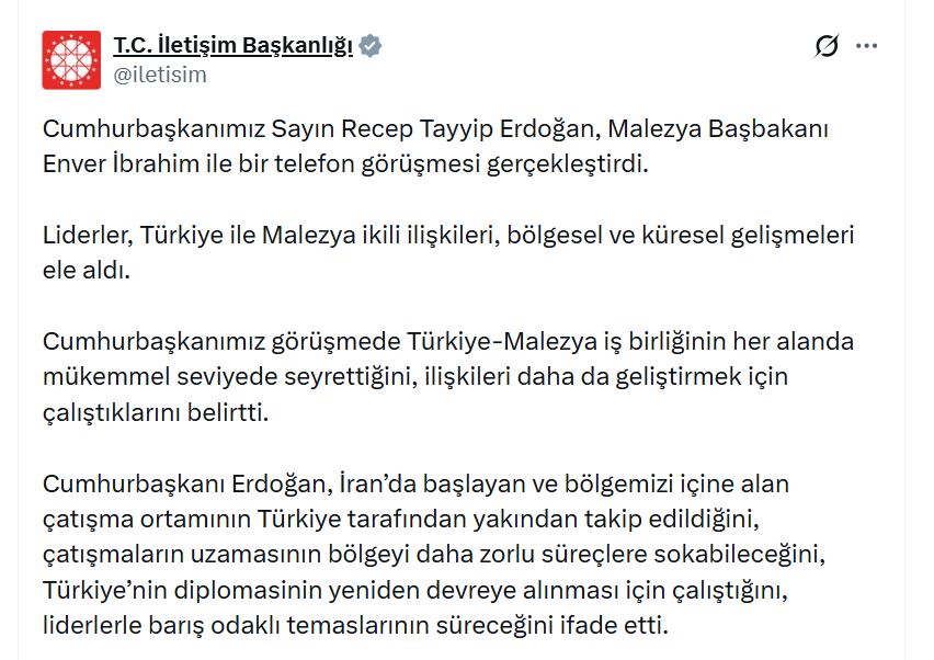 İletişim Başkanlığının sanal medya hesabından yapılan açıklamada, “Cumhurbaşkanımız Sayın Recep Tayyip Erdoğan, Malezya Başbakanı Enver İbrahim ile bir telefon görüşmesi gerçekleştirdi. Liderler, Türkiye ile Malezya ikili ilişkileri, bölgesel ve küresel gelişmeleri ele aldı. Cumhurbaşkanımız görüşmede Türkiye-Malezya iş birliğinin her alanda mükemmel seviyede seyrettiğini, ilişkileri daha da geliştirmek için çalıştıklarını belirtti. Cumhurbaşkanı Erdoğan, İranda başlayan ve bölgemizi içine alan çatışma ortamının Türkiye tarafından yakından takip edildiğini, çatışmaların uzamasının bölgeyi daha zorlu süreçlere sokabileceğini, Türkiyenin diplomasinin yeniden devreye alınması için çalıştığını, liderlerle barış odaklı temaslarının süreceğini ifade etti” denildi.
