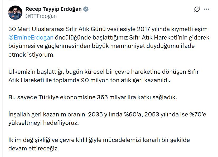 Cumhurbaşkanı Erdoğan, 30 Mart Uluslararası Sıfır Atık Günü nedeniyle sanal medya hesabından açıklama yaptı. Erdoğan, “2017 yılında kıymetli eşim Emine Erdoğan öncülüğünde başlattığımız Sıfır Atık Hareketinin giderek büyümesi ve güçlenmesinden büyük memnuniyet duyduğumu ifade etmek istiyorum. Ülkemizin başlattığı, bugün küresel bir çevre hareketine dönüşen Sıfır Atık Hareketi ile toplamda 90 milyon ton atık geri kazanıldı. Bu sayede Türkiye ekonomisine 365 milyar lira katkı sağladık. İnşallah geri kazanım oranını 2035 yılında yüzde 60a, 2053 yılında ise yüzde 70e yükseltmeyi hedefliyoruz. İklim değişikliği ve çevre kirliliğiyle mücadelemizi kararlı bir şekilde devam ettireceğiz” dedi.