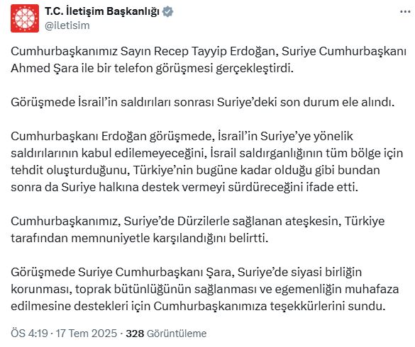 İletişim Başkanlığından yapılan açıklamada, “Cumhurbaşkanımız Sayın Recep Tayyip Erdoğan, Suriye Cumhurbaşkanı Ahmed Şara ile bir telefon görüşmesi gerçekleştirdi. Görüşmede İsrail’in saldırıları sonrası Suriye’deki son durum ele alındı. Cumhurbaşkanı Erdoğan görüşmede, İsrail’in Suriye’ye yönelik saldırılarının kabul edilemeyeceğini, İsrail saldırganlığının tüm bölge için tehdit oluşturduğunu, Türkiye’nin bugüne kadar olduğu gibi bundan sonra da Suriye halkına destek vermeyi sürdüreceğini ifade etti. Cumhurbaşkanımız, Suriye’de Dürzilerle sağlanan ateşkesin, Türkiye tarafından memnuniyetle karşılandığını belirtti. Görüşmede Suriye Cumhurbaşkanı Şara, Suriye’de siyasi birliğin korunması, toprak bütünlüğünün sağlanması ve egemenliğin muhafaza edilmesine destekleri için Cumhurbaşkanımıza teşekkürlerini sundu” ifadelerine yer verildi.