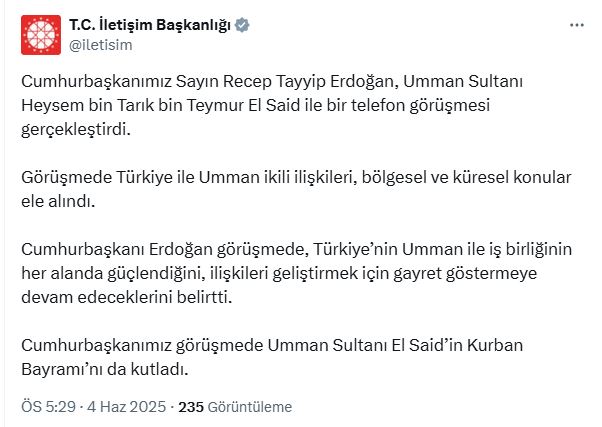 İletişim Başkanlığından yapılan açıklamaya göre; Cumhurbaşkanı Recep Tayyip Erdoğan, Umman Sultanı Heysem bin Tarık bin Teymur El Said ile bir telefon görüşmesi gerçekleştirdi. Görüşmede Türkiye ile Umman ikili ilişkileri, bölgesel ve küresel konular ele alındı. Cumhurbaşkanı Erdoğan görüşmede, Türkiyenin Umman ile iş birliğinin her alanda güçlendiğini, ilişkileri geliştirmek için gayret göstermeye devam edeceklerini belirtti. Erdoğan, Umman Sultanı El Saidin Kurban Bayramını da kutladı.