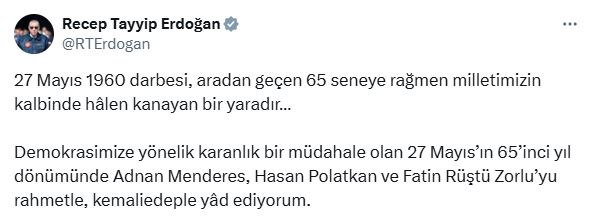 Cumhurbaşkanı Erdoğan, sosyal medya hesabından paylaştığı mesajda, “27 Mayıs 1960 darbesi, aradan geçen 65 seneye rağmen milletimizin kalbinde halen kanayan bir yaradır. Demokrasimize yönelik karanlık bir müdahale olan 27 Mayısın 65inci yıl dönümünde Adnan Menderes, Hasan Polatkan ve Fatin Rüştü Zorluyu rahmetle, kemaliedeple yad ediyorum” ifadelerini kullandı.