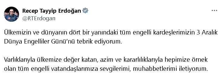Cumhurbaşkanı Erdoğan, 3 Aralık Dünya Engelliler Günü dolayısıyla sosyal medya hesabından mesaj yayınladı. Erdoğan, “Ülkemizin ve dünyanın dört bir yanındaki tüm engelli kardeşlerimizin 3 Aralık Dünya Engelliler Günü’nü tebrik ediyorum. Varlıklarıyla ülkemize değer katan, azim ve kararlılıklarıyla hepimize örnek olan tüm engelli vatandaşlarımıza sevgilerimi, muhabbetlerimi iletiyorum” ifadelerini kullandı.