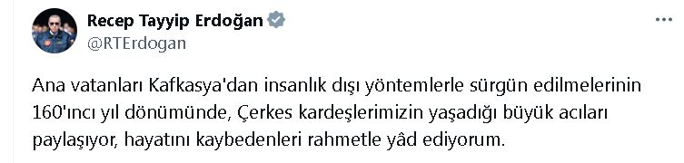 Cumhurbaşkanı Erdoğan, sosyal medya hesabından yaptığı açıklamada, “Ana vatanları Kafkasyadan insanlık dışı yöntemlerle sürgün edilmelerinin 160ıncı yıl dönümünde, Çerkes kardeşlerimizin yaşadığı büyük acıları paylaşıyor, hayatını kaybedenleri rahmetle yad ediyorum” dedi.