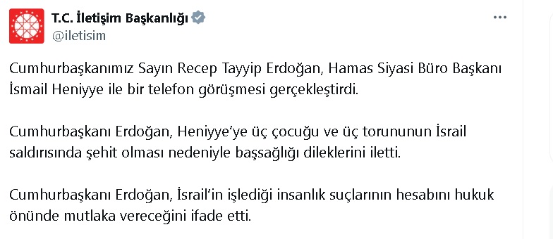 CUMHURBAŞKANI Recep Tayyip Erdoğan, Hamas Siyasi Büro Başkanı İsmail Heniyye ile telefonla görüşüp, başsağlığı dileklerini iletti.İletişim Başkanlığının sosyal medya hesabından görüşmeye ilişkin yapılan açıklamada, “Cumhurbaşkanımız Sayın Recep Tayyip Erdoğan, Hamas Siyasi Büro Başkanı İsmail Heniyye ile bir telefon görüşmesi gerçekleştirdi. Cumhurbaşkanı Erdoğan, Heniyyeye üç çocuğu ve üç torununun İsrail saldırısında şehit olması nedeniyle başsağlığı dileklerini iletti. Cumhurbaşkanı Erdoğan, İsrailin işlediği insanlık suçlarının hesabını hukuk önünde mutlaka vereceğini ifade etti” denildi.