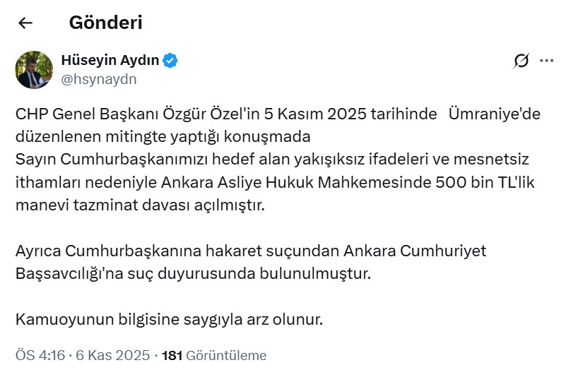 Cumhurbaşkanı Erdoğanın avukatı Hüseyin Aydın, sosyal medya hesabından yaptığı açıklamada, “CHP Genel Başkanı Özgür Özelin 5 Kasım 2025 tarihinde Ümraniyede düzenlenen mitingde yaptığı konuşmada Sayın Cumhurbaşkanımızı hedef alan yakışıksız ifadeleri ve mesnetsiz ithamları nedeniyle Ankara Asliye Hukuk Mahkemesinde 500 bin TLlik manevi tazminat davası açılmıştır. Ayrıca Cumhurbaşkanına hakaret suçundan Ankara Cumhuriyet Başsavcılığına suç duyurusunda bulunulmuştur” ifadelerini kullandı.