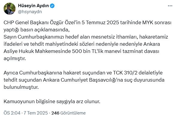 Cumhurbaşkanı Erdoğanın avukatı Hüseyin Aydın, sosyal medya hesabından yaptığı açıklamada, “CHP Genel Başkanı Özgür Özelin 5 Temmuz 2025 tarihinde MYK sonrası yaptığı basın açıklamasında, Sayın Cumhurbaşkanımızı hedef alan mesnetsiz ithamları, hakaretamiz ifadeleri ve tehdit mahiyetindeki sözleri nedeniyle Ankara Asliye Hukuk Mahkemesinde 500 bin TLlik manevi tazminat davası açılmıştır. Ayrıca Cumhurbaşkanına hakaret suçundan ve TCK 310/2 delaletiyle tehdit suçundan Ankara Cumhuriyet Başsavcılığına suç duyurusunda bulunulmuştur” ifadelerini kullandı.