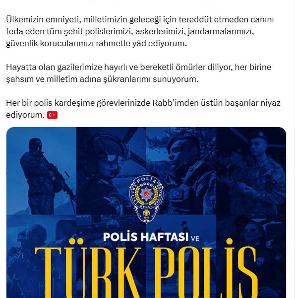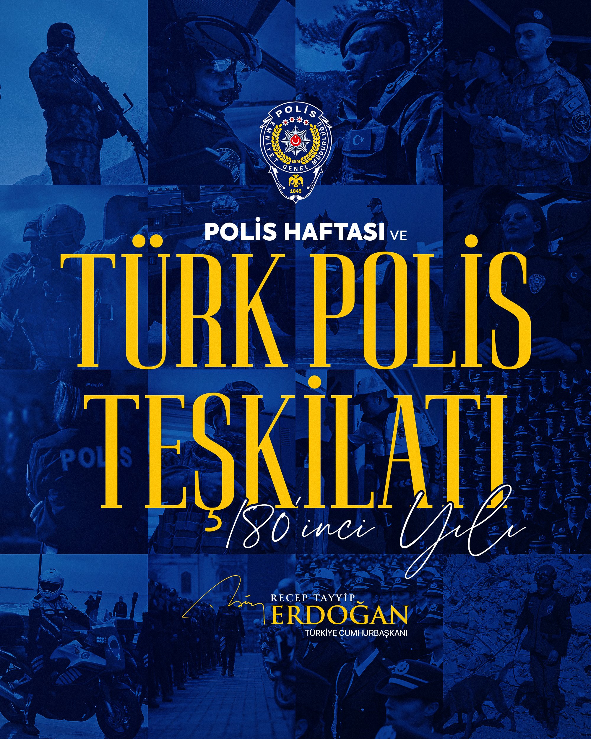 Cumhurbaşkanı Erdoğan, Türk Polis Teşkilatının kuruluşunun 180inci yıl dönümü nedeniyle mesaj paylaştı. Erdoğan, “Türk Polis Teşkilatımızın kuruluşunun 180’inci yıl dönümünü canıgönülden tebrik ediyor; Polis Haftası’nın Emniyet Teşkilatımız, ülkemiz ve milletimiz için hayırlara vesile olmasını diliyorum. Ülkemizin emniyeti, milletimizin geleceği için tereddüt etmeden canını feda eden tüm şehit polislerimizi, askerlerimizi, jandarmalarımızı, güvenlik korucularımızı rahmetle yad ediyorum. Hayatta olan gazilerimize hayırlı ve bereketli ömürler diliyor, her birine şahsım ve milletim adına şükranlarımı sunuyorum. Her bir polis kardeşime görevlerinizde Rabb’imden üstün başarılar niyaz ediyorum” ifadelerini kullandı.