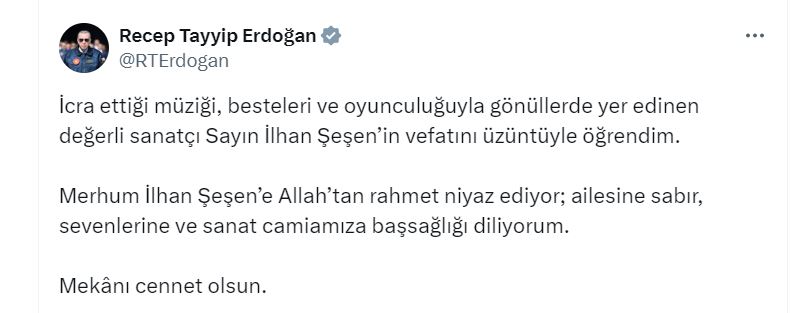 Cumhurbaşkanı Erdoğan, sosyal medya hesabından yayımladığı taziye mesajında, “İcra ettiği müziği, besteleri ve oyunculuğuyla gönüllerde yer edinen değerli sanatçı Sayın İlhan Şeşen’in vefatını üzüntüyle öğrendim. Merhum İlhan Şeşene Allahtan rahmet niyaz ediyor; ailesine sabır, sevenlerine ve sanat camiamıza başsağlığı diliyorum. Mekanı cennet olsun” dedi.