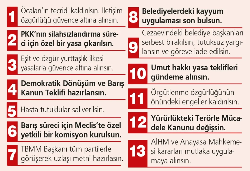 Öte yandan ana muhalefet partisi CHP de sürece kendi perspektifinden katkı sunuyor. Kısa süre önce duyurulan “Demokratikleşme Paketi”nde, kayyum uygulamalarının kaldırılması, basın ve ifade özgürlüğünün güvence altına alınması, dezenformasyon yasasının iptali ve “Cumhurbaşkanına hakaret” suçunun yeniden düzenlenmesi gibi öneriler yer alıyor.