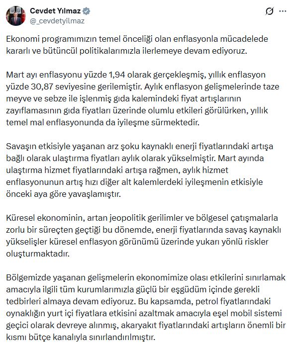 Cumhurbaşkanı Yardımcısı Cevdet Yılmaz, mart ayı enflasyon verilerine ilişkin sanal medya hesabından açıklamada, “Ekonomi programımızın temel önceliği olan enflasyonla mücadelede kararlı ve bütüncül politikalarımızla ilerlemeye devam ediyoruz. Mart ayı enflasyonu yüzde 1,94 olarak gerçekleşmiş, yıllık enflasyon yüzde 30,87 seviyesine gerilemiştir. Aylık enflasyon gelişmelerinde taze meyve ve sebze ile işlenmiş gıda kalemindeki fiyat artışlarının zayıflamasının gıda fiyatları üzerinde olumlu etkileri görülürken, yıllık temel mal enflasyonunda da iyileşme sürmektedir” ifadelerini kullandı.