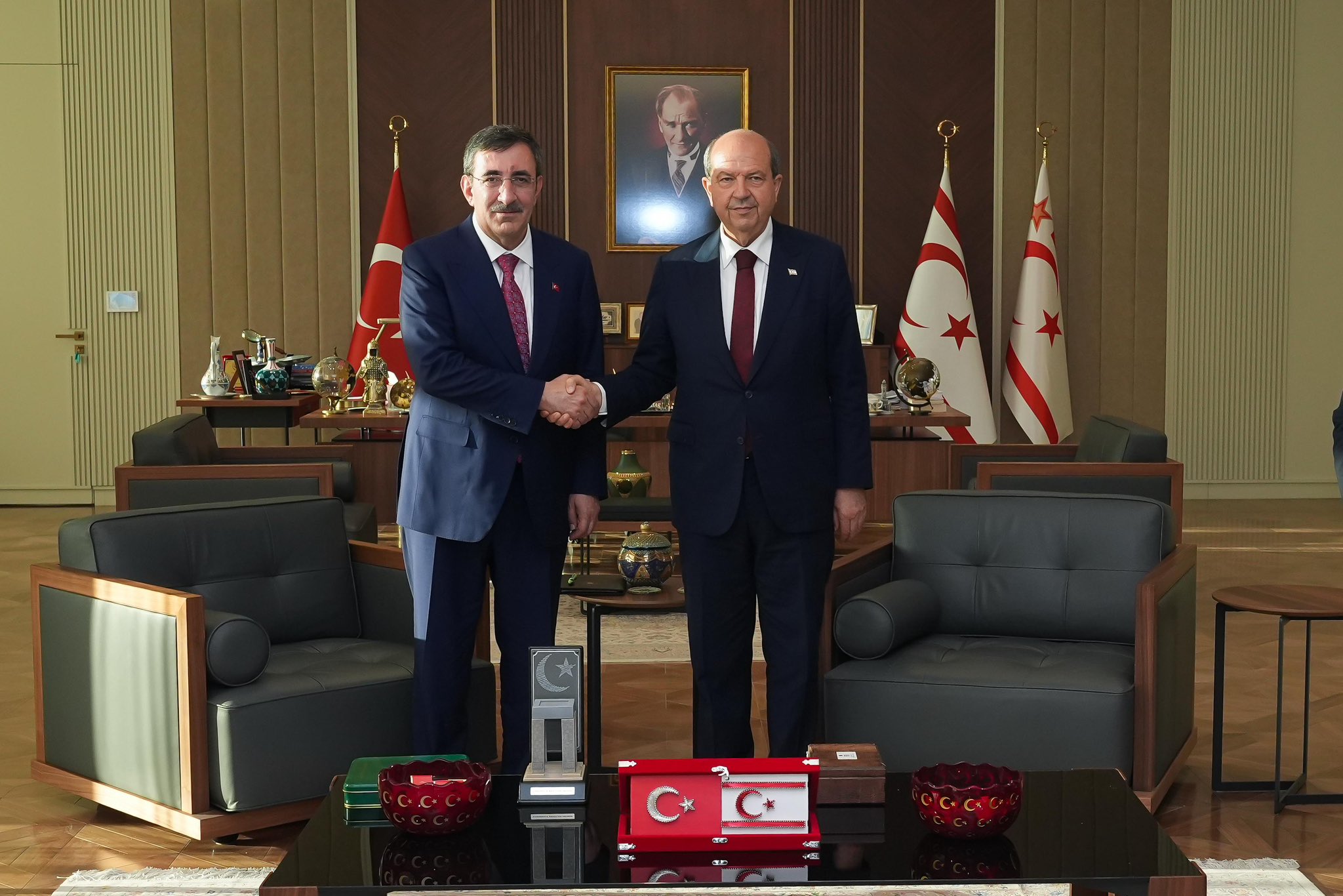 Cumhurbaşkanı Yardımcısı Cevdet Yılmaz, sosyal medya hesabından yaptığı paylaşımda “Her zaman bir ve beraber olduğumuz Kuzey Kıbrıs Türk Cumhuriyeti’ndeki temaslarımıza devam ediyoruz. KKTC Cumhurbaşkanı Sayın Ersin Tatar, Başbakan Sayın Ünal Üstel ve hükümet ortaklarıyla birlikte, Cumhurbaşkanlığı Yerleşkesi’nde bir araya geldik. İktisadi ve mali iş birliği protokolü çerçevesinde, devam eden projeleri ve önümüzdeki dönemde hayata geçirilecek stratejik yatırımları kapsamlı şekilde değerlendirdik. Nazik ev sahiplikleri için Sayın Tatar’a teşekkür ediyorum” ifadelerini kullandı.