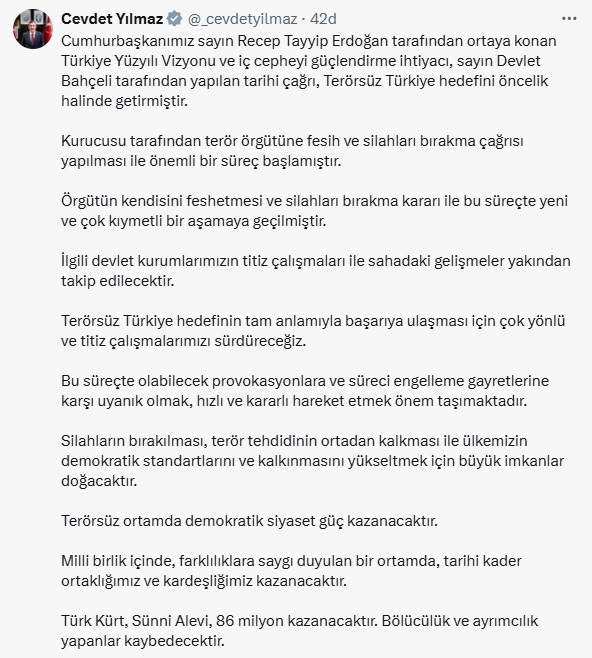Cumhurbaşkanı Yardımcısı Cevdet Yılmaz, terör örgütü PKKnın fesih ve silah bırakma kararına ilişkin sosyal medya hesabından açıklamada bulundu. Yılmaz, Cumhurbaşkanı Recep Tayyip Erdoğan tarafından ortaya konulan Türkiye Yüzyılı vizyonu ile iç cepheyi güçlendirme ihtiyacı ve Devlet Bahçeli tarafından yapılan tarihi çağrının, Terörsüz Türkiye hedefini öncelik haline getirdiğini belirterek, “Kurucusu tarafından terör örgütüne fesih ve silahları bırakma çağrısı yapılması ile önemli bir süreç başlamıştır. Örgütün kendisini feshetmesi ve silahları bırakma kararı ile bu süreçte yeni ve çok kıymetli bir aşamaya geçilmiştir. İlgili devlet kurumlarımızın titiz çalışmaları ile sahadaki gelişmeler yakından takip edilecektir. Terörsüz Türkiye hedefinin tam anlamıyla başarıya ulaşması için çok yönlü ve titiz çalışmalarımızı sürdüreceğiz. Bu süreçte olabilecek provokasyonlara ve süreci engelleme gayretlerine karşı uyanık olmak, hızlı ve kararlı hareket etmek önem taşımaktadır. Silahların bırakılması, terör tehdidinin ortadan kalkması ile ülkemizin demokratik standartlarını ve kalkınmasını yükseltmek için büyük imkanlar doğacaktır” ifadelerini kullandı.
