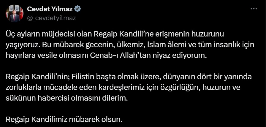 Cumhurbaşkanı Yardımcısı Cevdet Yılmaz, sosyal medya hesabından yaptığı paylaşımda, “Üç ayların müjdecisi olan Regaip Kandiline erişmenin huzurunu yaşıyoruz. Bu mübarek gecenin, ülkemiz, İslam alemi ve tüm insanlık için hayırlara vesile olmasını Cenab-ı Allahtan niyaz ediyorum. Regaip Kandilinin; Filistin başta olmak üzere, dünyanın dört bir yanında zorluklarla mücadele eden kardeşlerimiz için özgürlüğün, huzurun ve sükunun habercisi olmasını dilerim. Regaip Kandilimiz mübarek olsun” dedi.