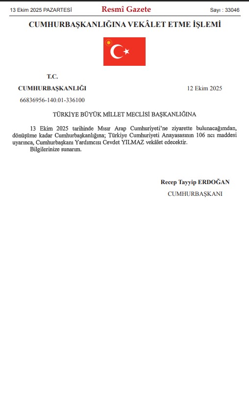 Cumhurbaşkanlığına, Cumhurbaşkanı Yardımcısı Yılmazın vekalet etmesine dair tezkere, Resmi Gazetede yayımlandı. Tezkereye göre, Cumhurbaşkanı Erdoğan 13 Ekim’de Mısır Arap Cumhuriyeti’ne ziyarette bulunacağından, dönüşüne kadar Cumhurbaşkanlığına; Türkiye Cumhuriyeti Anayasasının 106ncı maddesi uyarınca, Cumhurbaşkanı Yardımcısı Cevdet Yılmaz vekalet edecek.