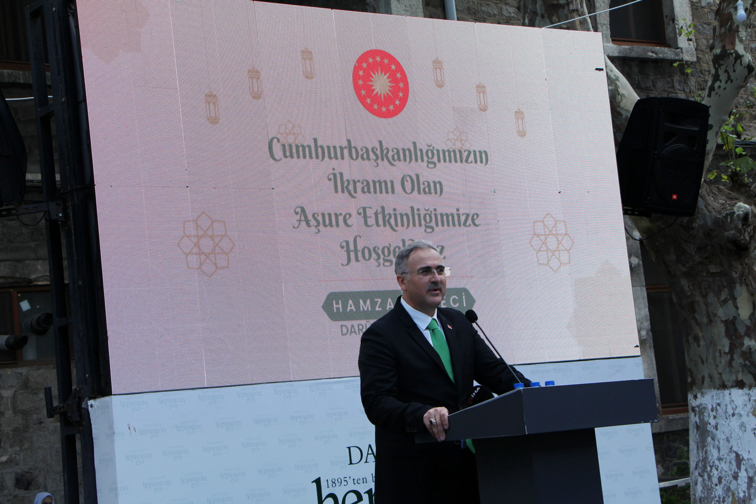 Aşure dağıtımından önce Huber Köşkü Daire Başkanı Cengizhan Başaran ve Darülaceze Başkanı ve Cumhurbaşkanı Danışmanı Hamza Cebeci açıklamalarda bulundu.