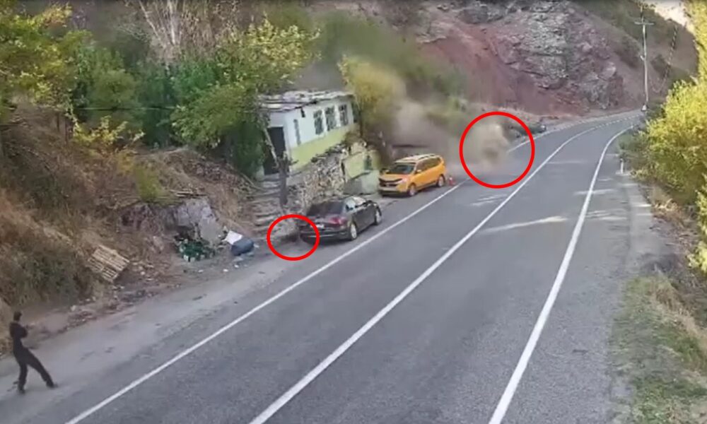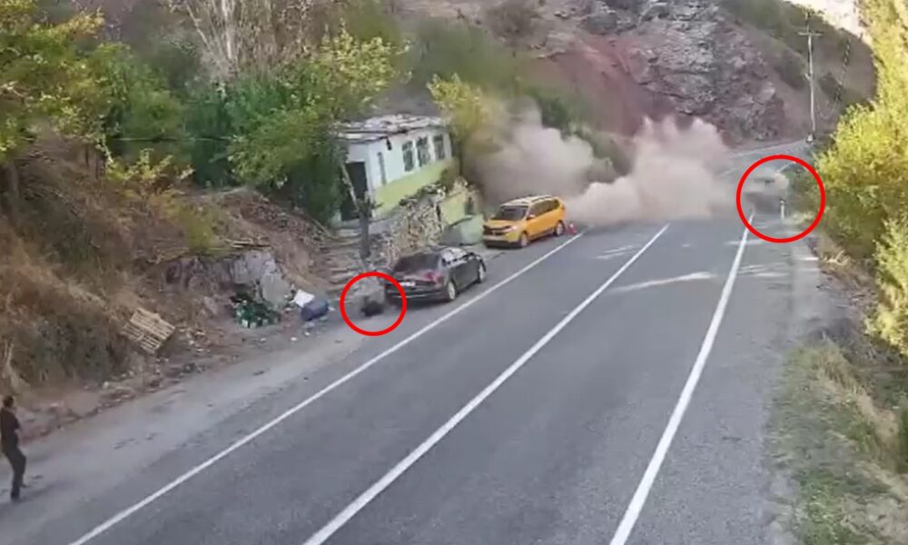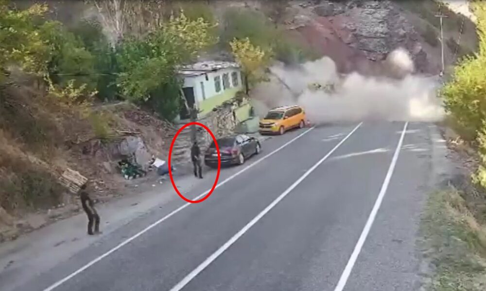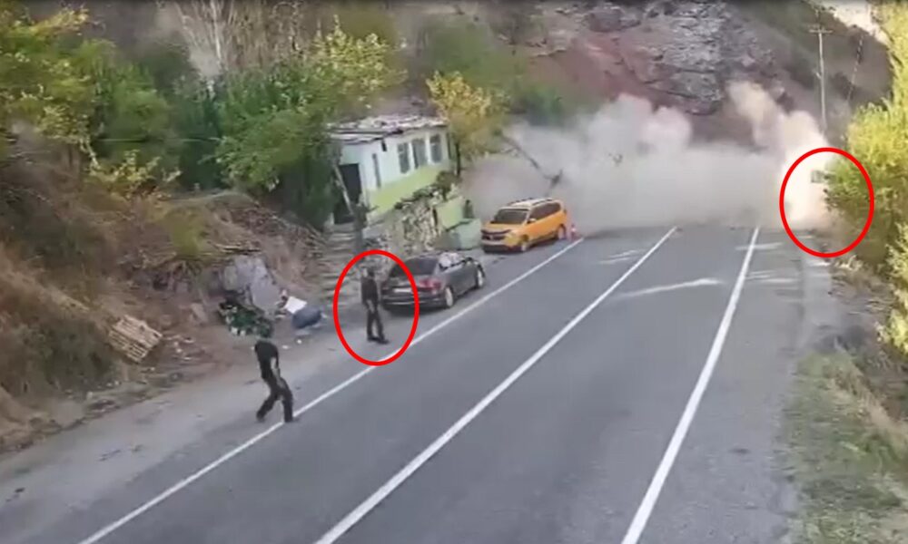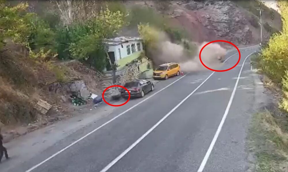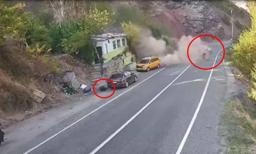 Olay, dün Tunceli-Erzincan kara yolunun 20’nci kilometresindeki Kara Haydar mevkisinde meydana geldi. Sık sık kaya düşmelerinin yaşandığı belirtilen yerde biri taksi ile otomobil park halindeyken dağdan kaya parçaları koptu. Otomobilin sürücüsü taksiye doğru gelen kaya parçalarını görerek şoförü uyardı. Durumu fark eden taksinin şoförü hızla koşarak bölgeden uzaklaştı. Olayda yaralanan olmazken, düşen büyük bir kaya parçası yolu aşıp Pülümür çayına düştü. O anlar güvenlik kamerasına yansıdı. Geçen yıl da aynı bölgede 2 kişi kaya düşmesi sonucu yaşamını yitirmişti.