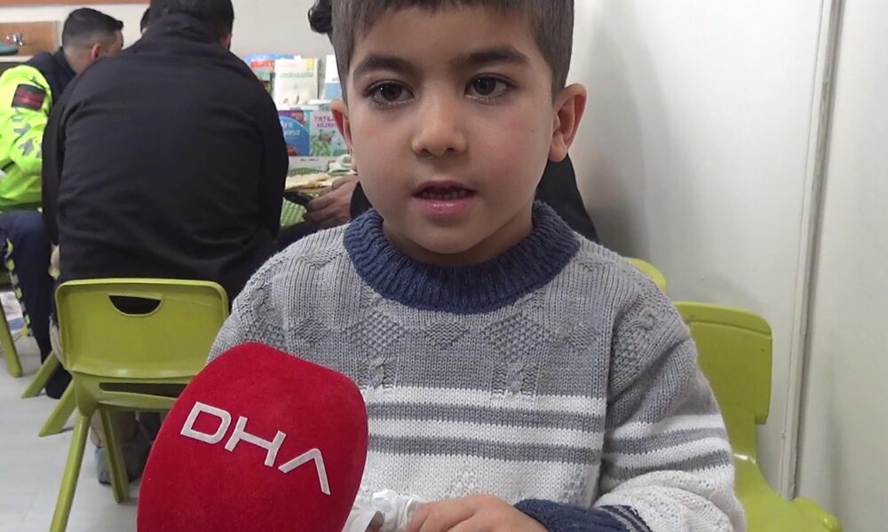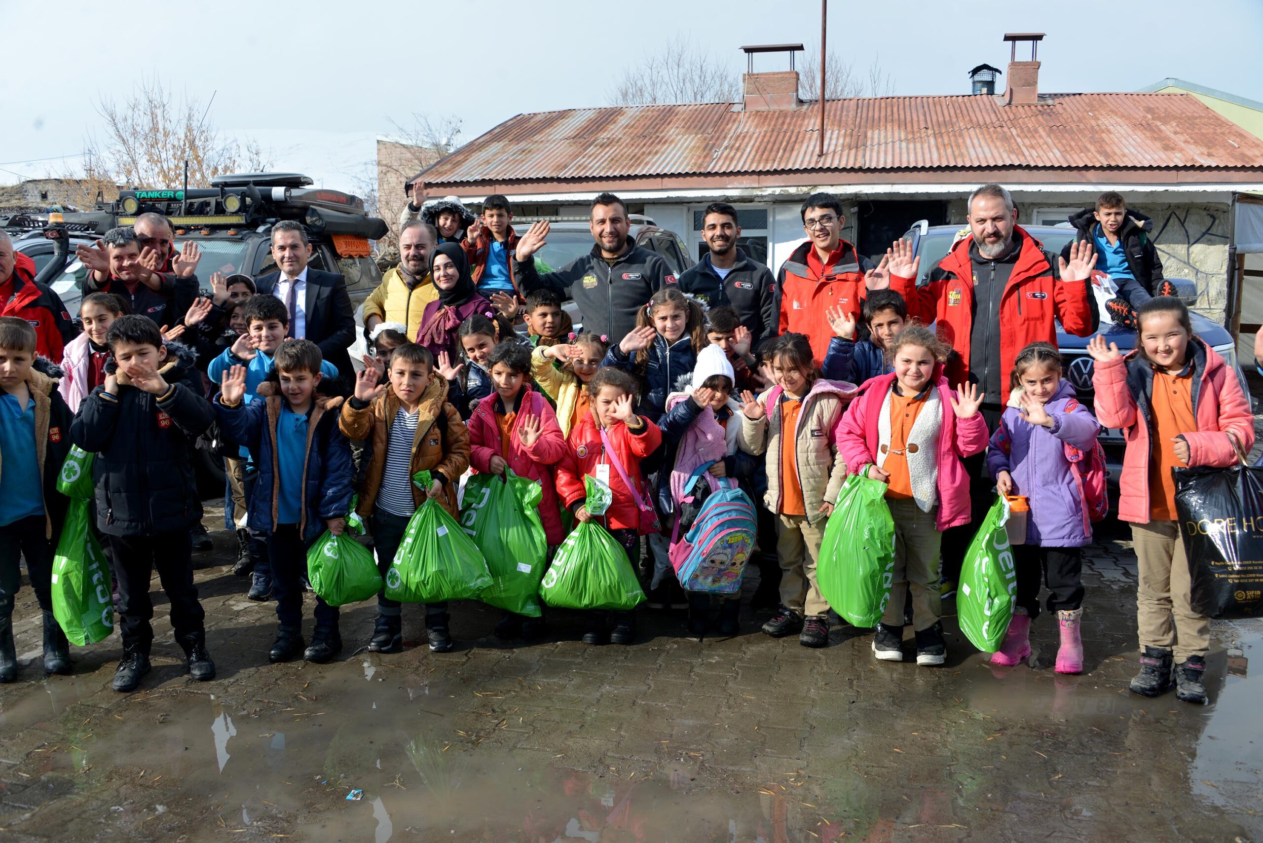 Hediye dağıtımından sonra öğrenci, öğretmen ve ziyaretçiler hatıra fotoğrafı çekildi. Fotoğraf: Oktay POLAT / Erzurum, (DHA)