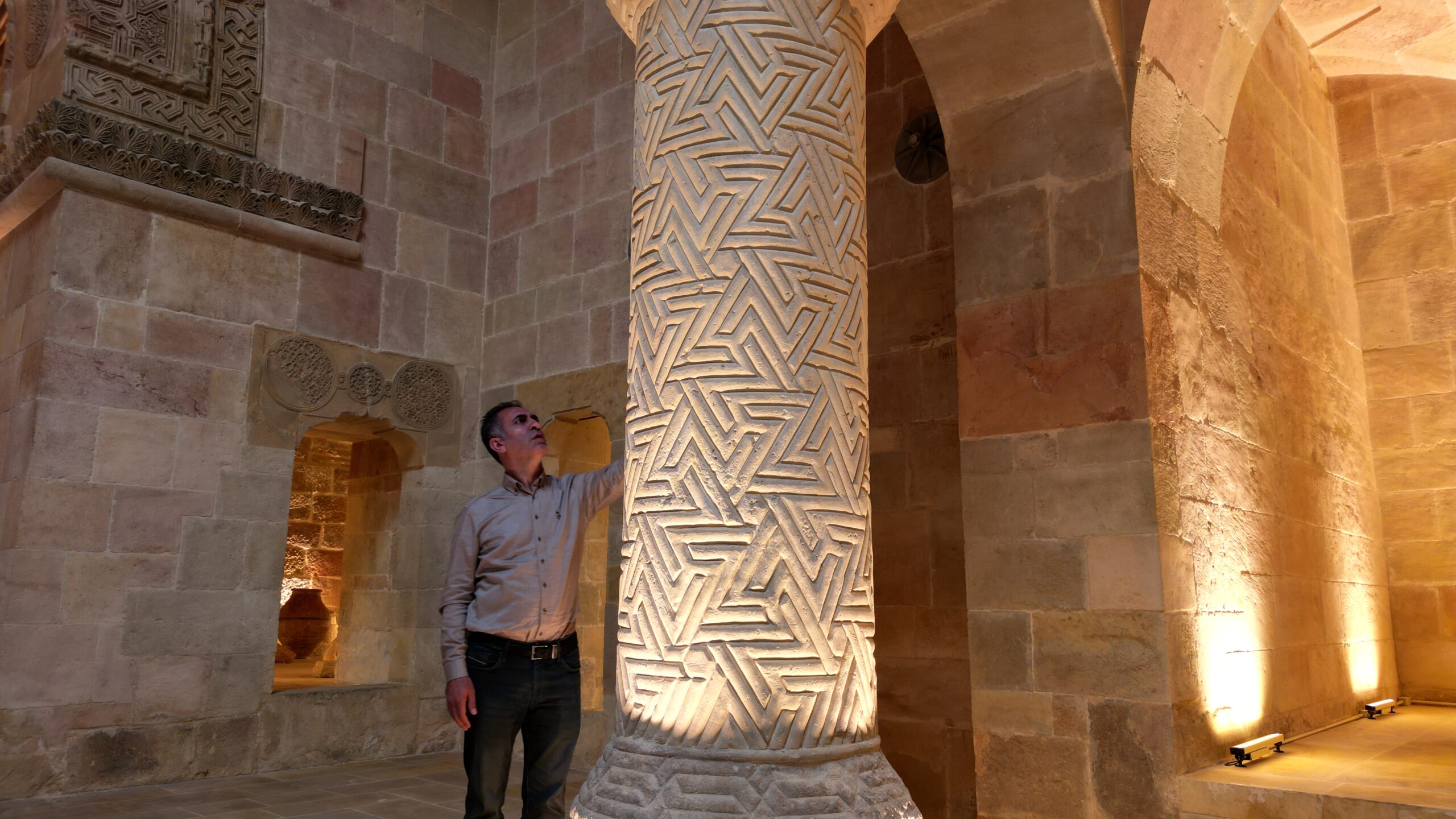 • Divriği Ulu Camii'nin darüşşifa bölümünde yer alan sütunlardan birinin Latince z harfi şeklindeki sarmal bezemesi, özellikle yabancı turistlerin ilgisini çekiyor. Cami müezzini Nail Ayan(Fotoğrafta) Fotoğraf: Hüsnü Ümit AVCI/Sivas, (DHA)