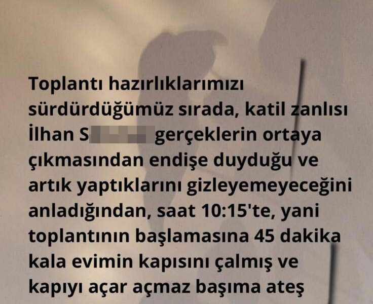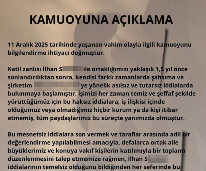 Olayın ardından M.Ş., sosyal medya hesabından açıklama yaptı. İlhan S. ile yaklaşık 1,5 yıl önce ortaklıklarını sonlandırdıklarını belirten M.Ş., “Kendisi farklı zamanlarda şahsıma ve şirketime yönelik asılsız ve tutarsız iddialarda bulunmaya başlamıştır. Bu mesnetsiz iddialara son vermek ve taraflar arasında adil bir değerlendirme yapılabilmesi amacıyla, defalarca ortak aile büyüklerimiz ve konuya vakıf kişilerin katılımıyla bir toplantı düzenlenmesini talep etmemize rağmen, İlhan S. iddialarının temelsiz olduğunu bildiğinden her seferinde bu toplantıyı reddetmiştir. Sonrasında, kendisinin de itiraz edemeyeceği şekilde tarafsız kişilerin belirlendiği ve elimizdeki kanıtların sunulacağı bir toplantının 11 Aralık 2025 günü saat 11.00de tarafsız bir grubun huzurunda yapılması kararlaştırılmıştır. Toplantı hazırlıklarımızı sürdürdüğümüz sırada, katil zanlısı İlhan S. gerçeklerin ortaya çıkmasından endişe duyduğu ve artık yaptıklarını gizleyemeyeceğini anladığından, saat 10.15te yani toplantının başlamasına 45 dakika kala evimin kapısını çalmış ve kapıyı açar açmaz başıma ateş etmiştir. Mucize eseri hayatta kaldım. Beni vurduktan sonra, yaklaşık 500 metre mesafedeki ofisime yürüyerek gitmiş ve orada hiçbir vicdanın kabul edemeyeceği canice bir saldırıda bulunmuştur. Ablam Deniz Şişmanı vahşice katletmiş, ardından babam Ş.Ş.ye 4 el ateş etmiştir. Güvenlik kamera kayıtlarından, elinde silahla diğer odalarda başka kimler olduğunu araştırdığı ve ofisimize ziyarete gelen 18 yaşın altındaki bir gencin saklanarak kurtulduğu görülmüştür. Hiçbir kültürde ve dinde karşılığı olmayan bu vahşetin, vicdanlarda asla kabul edilemeyecek bir davranış olduğuna inanıyorum” ifadelerine yer verdi.