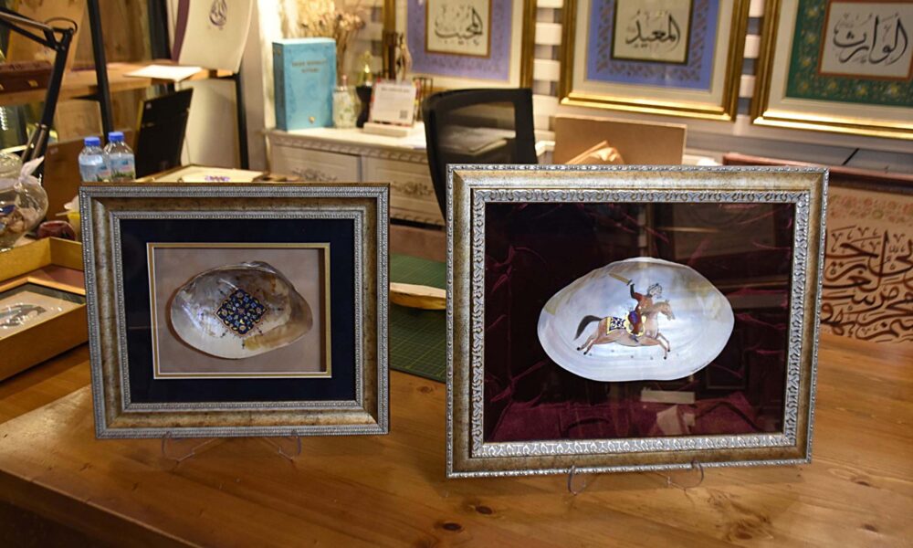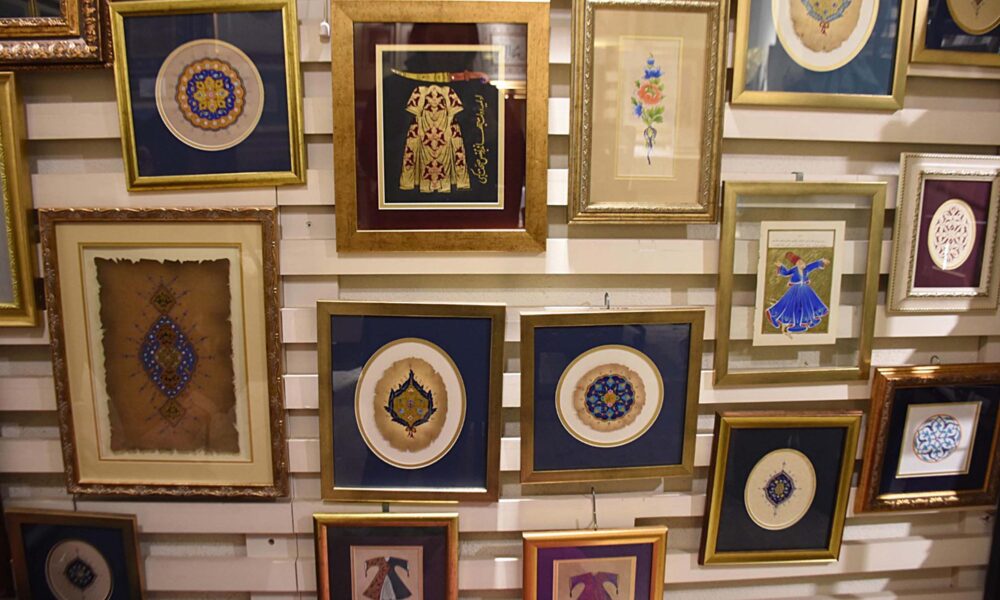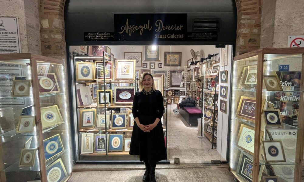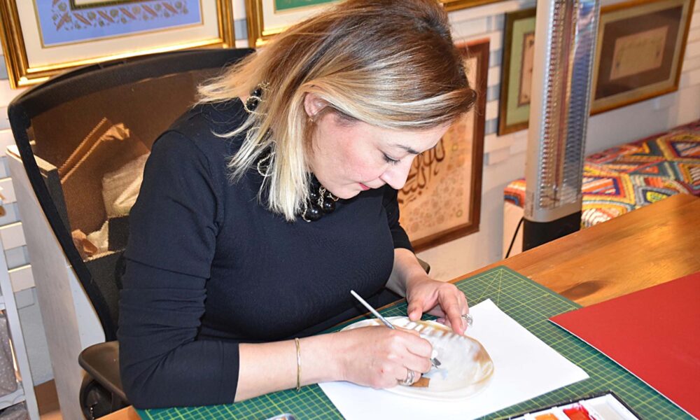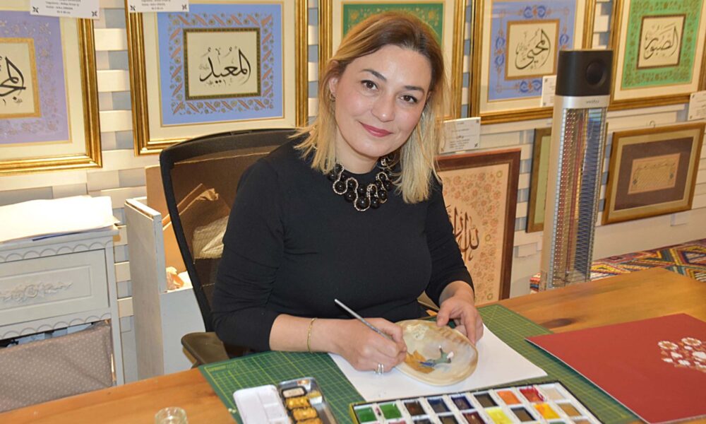 • İzmir'in tarihi Kemeraltı Çarşısı'nda bulunan atölyesinde çalışmalarını sürdüren Ayşegül Devecier, eğitimini aldığı tezhip sanatını sürdürüyor. Fotoğraf: Seza Nur ALPDÜNDAR / İzmir, (DHA)