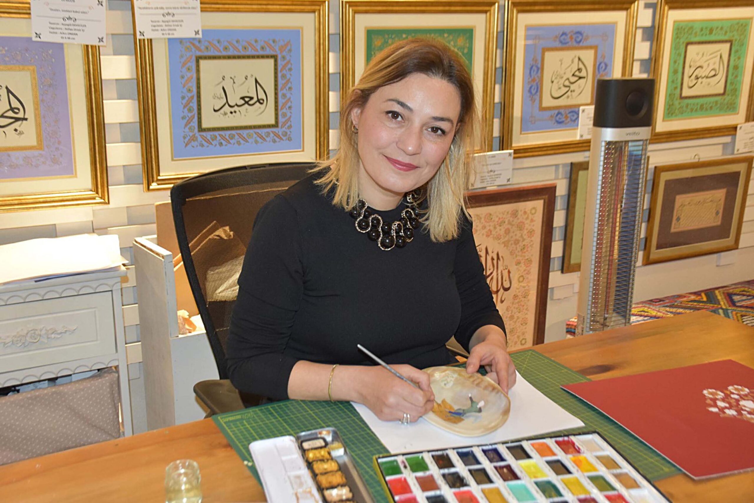 • İzmir'in tarihi Kemeraltı Çarşısı'nda bulunan atölyesinde çalışmalarını sürdüren Ayşegül Devecier (Fotoğrafta), eğitimini aldığı tezhip sanatını sürdürüyor. Fotoğraf: Seza Nur ALPDÜNDAR / İzmir, (DHA)
