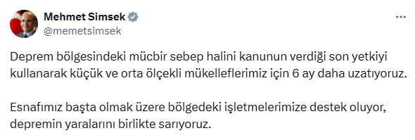 Hazine ve Maliye Bakanı Mehmet Şimşek, sosyal medya hesabından yaptığı açıklamada, “Deprem bölgesindeki mücbir sebep halini kanunun verdiği son yetkiyi kullanarak küçük ve orta ölçekli mükelleflerimiz için 6 ay daha uzatıyoruz. Esnafımız başta olmak üzere bölgedeki işletmelerimize destek oluyor, depremin yaralarını birlikte sarıyoruz” ifadelerini kullandı.