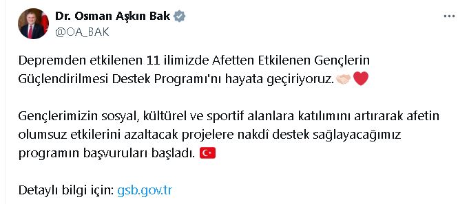 Bakan Osman Aşkın Bak, sosyal medya hesabından yaptığı açıklamada, “Depremden etkilenen 11 ilimizde Afetten Etkilenen Gençlerin Güçlendirilmesi Destek Programını hayata geçiriyoruz. Gençlerimizin sosyal, kültürel ve sportif alanlara katılımını artırarak afetin olumsuz etkilerini azaltacak projelere nakdi destek sağlayacağımız programın başvuruları başladı” ifadelerini kullandı.
