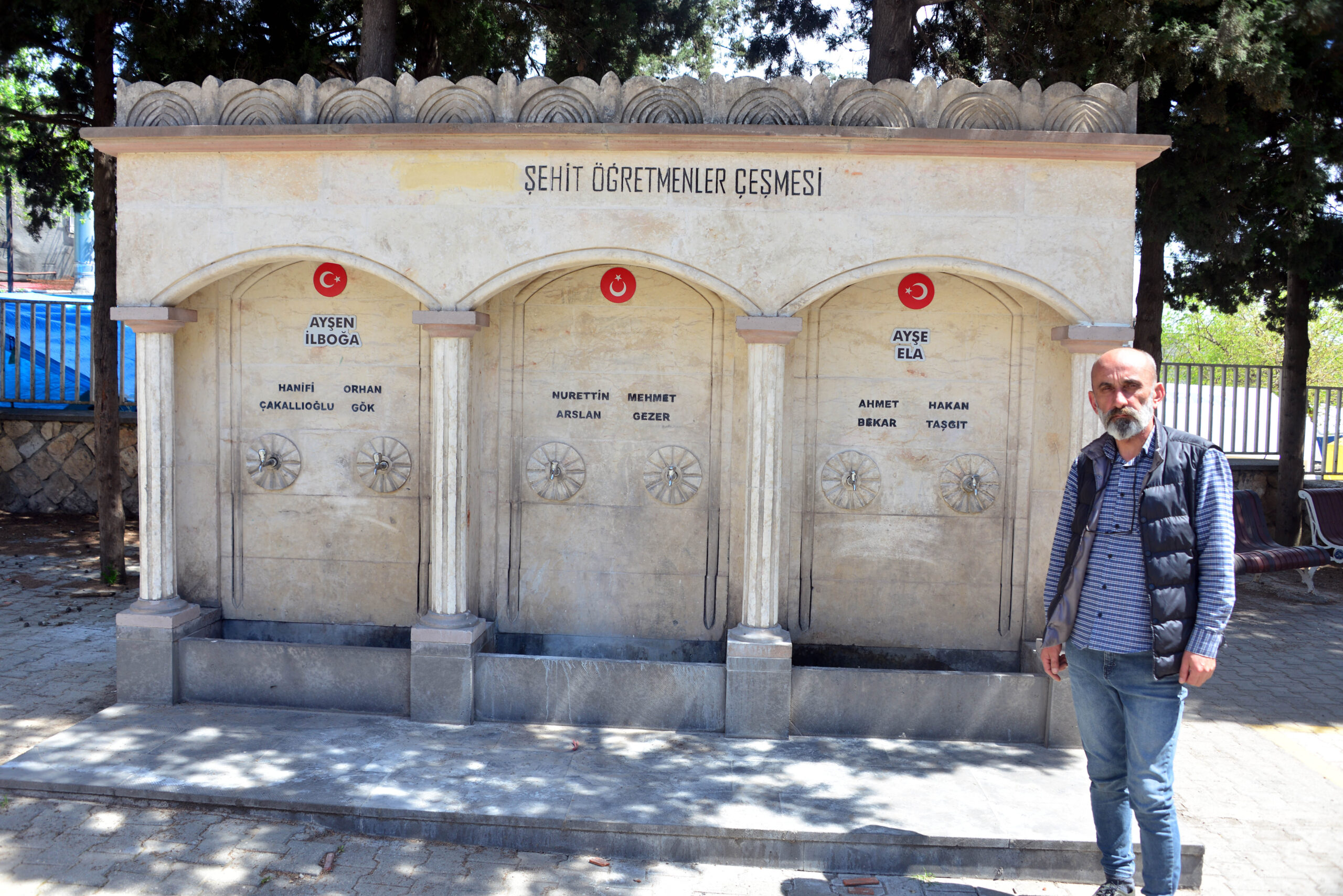 “6 Şubat’ta okulumuzda çalışan 2 tane öğretmenimizi kaybettik. Ayşe Ela hocamı, eşi Aytaç, kızı Ayşe Beril ve oğlu Ahmet’i kaybettik. Ayşen İlboğa öğretmenimi, eşi polis memuru Çağdaş Mehmet ve oğlu Ertuğrul’u kaybettik. Tabi acımız büyük, bu acıyla yaşamayı öğrendik fakat şehit olan öğretmenlerimizi duaya sebebiyet oluşturmak adına, onları unutmamak ve unutturmamak adına okulumuzda bir köşe yaptık. Depremden 10-15 gün sonra şehit öğretmenlerimizin sınıf dolaplarını açtığımızda orada şahıslarına ait olan eşyaları aldık, okulumuzun fetih kapısı olarak adlandırdığımız bölümünde bir sergi yeri açtık. Burada şehit öğretmenlerimizden kalan o hatıraları sergiliyoruz. İnşallah bu okul eğitim öğretime devam ettiği sürece de bu hatırları bizimle birlikte yaşayacak. Burada bulunan şehit öğretmenlerimiz hain PKK terör örgütünün şehit etmiş olduğu meslektaşlarımız, kardeşlerimiz. Orada 3 tane albayrağımız vardı, bu depremden sonra 2 öğretmenimizin de resimlerini oraya ekledik. Ayrıca okulumuzun bahçesinde şehit öğretmenler çeşmemiz var. Kahramanmaraşlı olup hain PKK terör örgütü tarafından şehit edilen 6 meslektaşımızın ismini vermiştik o çeşmemize. Osmanlı-Selçuklu mimarisi tarzındaki çeşmemize 6 Şubat’ta şehit verdiğimiz 2 öğretenimizin ismini de yazdık. Okulumuza gelen misafirler olsun, öğrencilerimize, velilerimiz olsun çeşmemizden su içerken şehitlerimize minnet borcunu ödesinler, duaya sebebiyet oluşturalım dedik.”