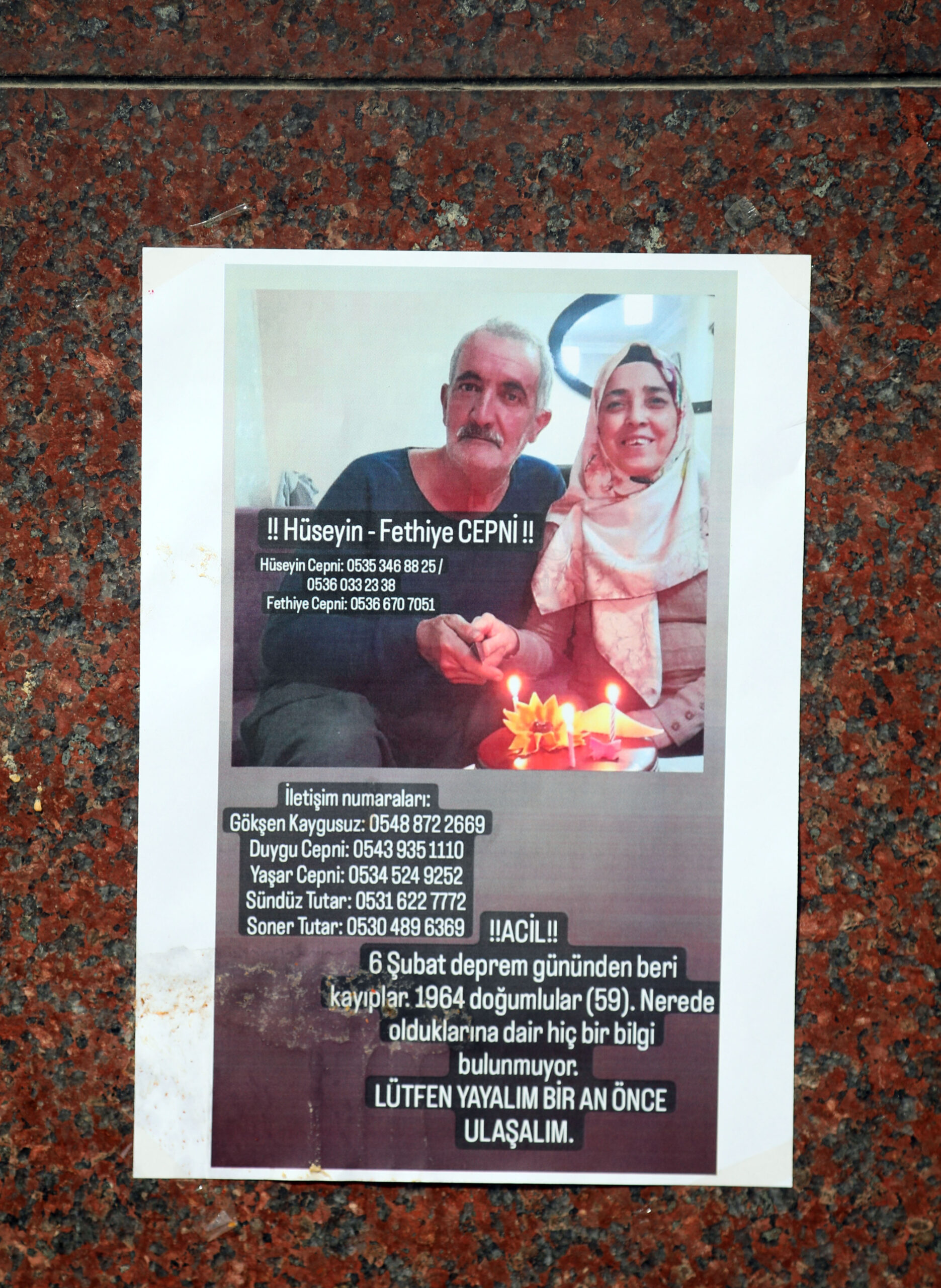 Antakya meydanındaki Atatürk büstünün kaidesindeki Hüseyin-Fethiye Çepni çiftine ait fotoğraflı ilanda, 59 yaşındaki çiftin, depremin olduğu 6 Şubat’tan beri kayıp oldukları belirtildi. Üzerinde yakınlarına ait isim ve iletişim numaraları olan ilanda, ‘Nerede olduklarına dair hiçbir bilgi bulunmuyor. Lütfen yayalım, bir an önce ulaşalım’ ifadeleri yer aldı.
