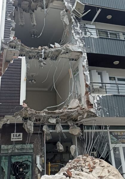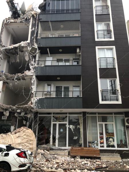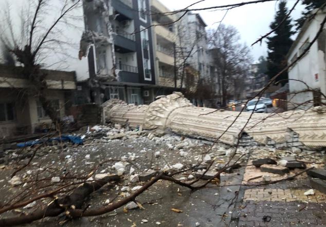 • Kahramanmaraş merkezli depremlerde Adıyaman Hastane Camisi'nin minaresinin üzerine devrildiği 4 katlı binada ağır hasar meydana geldi. Fotoğraf: Ankara, (DHA)