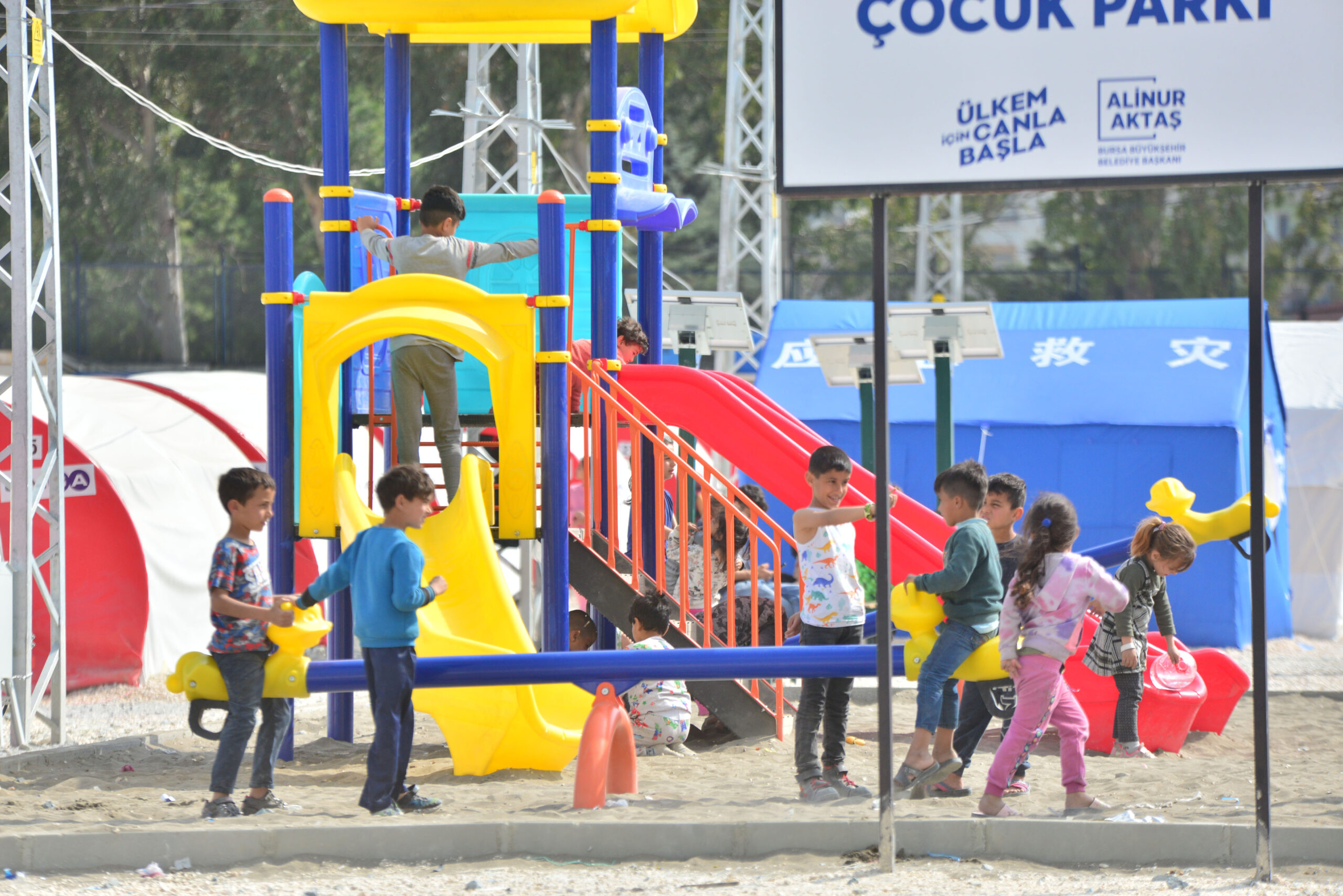 AFAD kontrolündeki bu çadır ve konteynerlerin bulunduğu yaşam alanlarına bazı belediyeler tarafından da çocuk parkları kuruldu. Depremzede ailelerin çocukları bu çadır kentlerde oluşturulan çocuk parklarında gün boyunca oyun oynayarak vakit geçiriyor.