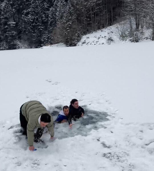 Derenin üzerinde zıplarken buz kırılınca suya düştüler; o anlar kamerada