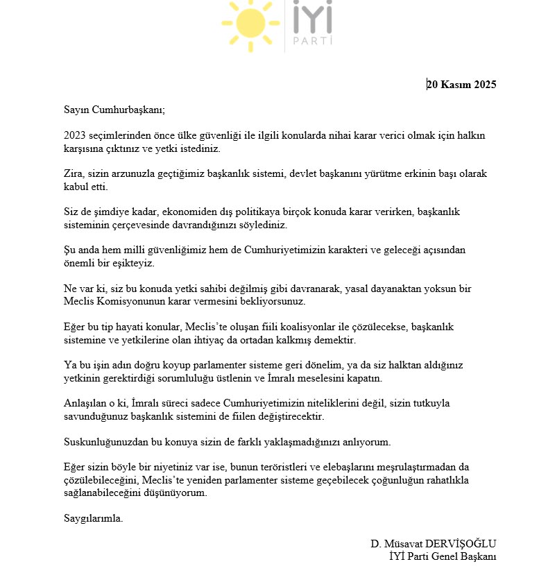 İYİ Parti Genel Başkanı Müsavat Dervişoğlu, mektubunda, “Sayın Cumhurbaşkanı; 2023 seçimlerinden önce ülke güvenliği ile ilgili konularda nihai karar verici olmak için halkın karşısına çıktınız ve yetki istediniz. Zira, sizin arzunuzla geçtiğimiz başkanlık sistemi, devlet başkanını yürütme erkinin başı olarak kabul etti. Siz de şimdiye kadar, ekonomiden dış politikaya birçok konuda karar verirken, başkanlık sisteminin çerçevesinde davrandığınızı söylediniz. Şu anda hem milli güvenliğimiz hem de Cumhuriyetimizin karakteri ve geleceği açısından önemli bir eşikteyiz. Ne var ki, siz bu konuda yetki sahibi değilmiş gibi davranarak, yasal dayanaktan yoksun bir Meclis Komisyonunun karar vermesini bekliyorsunuz. Eğer bu tip hayati konular, Mecliste oluşan fiili koalisyonlar ile çözülecekse, başkanlık sistemine ve yetkilerine olan ihtiyaç da ortadan kalkmış demektir. Ya bu işin adını doğru koyup parlamenter sisteme geri dönelim, ya da siz halktan aldığınız yetkinin gerektirdiği sorumluluğu üstlenin ve İmralı meselesini kapatın. Anlaşılan o ki, İmralı süreci sadece Cumhuriyetimizin niteliklerini değil, sizin tutkuyla savunduğunuz başkanlık sistemini de fiilen değiştirecektir. Suskunluğunuzdan bu konuya sizin de farklı yaklaşmadığınızı anlıyorum. Eğer sizin böyle bir niyetiniz var ise, bunun teröristleri ve elebaşlarını meşrulaştırmadan da çözülebileceğini, Mecliste yeniden parlamenter sisteme geçebilecek çoğunluğun rahatlıkla sağlanabileceğini düşünüyorum. Saygılarımla” ifadelerini kullandı.
