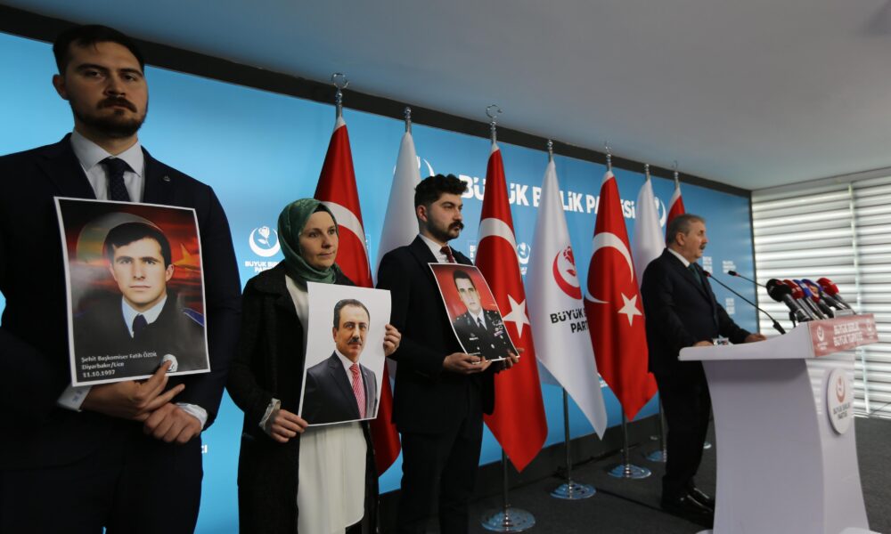 PKK’nın aldığı fesih kararını da değerlendiren Destici, “40 yıldan fazla bir süredir hain, kanlı ve dünyanın her noktasında her ülkesinde suç sayılan her türlü melaneti işlemiş bir terör örgütüyle mücadele edildi. Türkiye, terör örgütüne karşı yılmaz bir mücadele verdi ve bu mücadele de zaferle sonuçlandırıldı. Bu zafer, mücadele yoluyla elde edilmiştir. Türkiye sınırları içerisinde terörist kalmamıştır. Ya Suriyenin kuzeyine gitmişlerdir, ya Irakın kuzeyine kaçmışlardır ya da Avrupada soluk almışlardır. Terör örgütü gelinen noktada bir mecburiyet hasılıyla silahları bıraktığını ve kendini fesih ettiğini açıklamak zorunda kalmıştır. Terör örgütü ve yandaşları, paydaşları ve aralarındaki hain destekçileriyle birlikte Türkiye Cumhuriyetinin güvenlik güçleri tarafından, askerimiz polisimiz tarafından kesin bir yenilgiye uğratılmıştır. Büyük Birlik Partisi olarak bu zaferin hain terör örgütüne karşı amansız mücadelenin isimli ve isimsiz kahramanlarına hassaten, fotoğraflarını gördüğünüz Özel Harekat Daire Başkanlığı’ndan şehit Emniyet Amiri Fatih Özdil’e ve Özel Kuvvetler Komutanlığı’ndan şehit Binbaşı Zafer Kılıç’a ve tüm şehitlerimize ithaf ediyoruz. Bütün şehitlerimizin ruhları şad, mekanları cennet olsun” ifadelerinde bulundu.