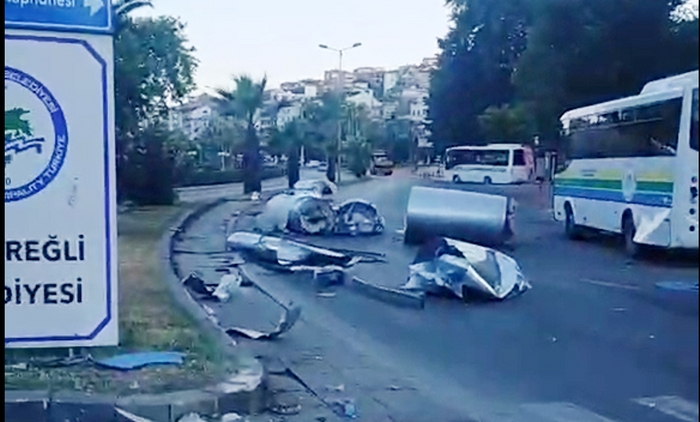 Kaza, sabah 06.00 sıralarında Ereğli ilçesi Müftü Mahallesi Ruhi Cöbek Bulvarında meydana geldi. Sezai Duysak (38) idaresindeki 67 ADX 687 plakalı rulo sac yüklü TIR, kontrolden çıkarak refüje çarptı. Yan yatarak sürüklenen TIR, İnönü Parkında bulunan Yaşlılar ve Gençler Evine çarparak durdu. TIRın dorsesinden savrulan rulo saclar ise 67 M 8022 plakalı belediye otobüsüne ve 34 RJ 837 plakalı hafif ticari araca çarparak zarara yol açtı. Çevredekilerin ihbarıyla olay yerine, polis, itfaiye ve sağlık ekipleri sevk edildi. Kazada yaralanan Sezai Duysak, özel bir hastaneye götürüldü. Duysakın durumunun iyi olduğu öğrenildi.