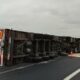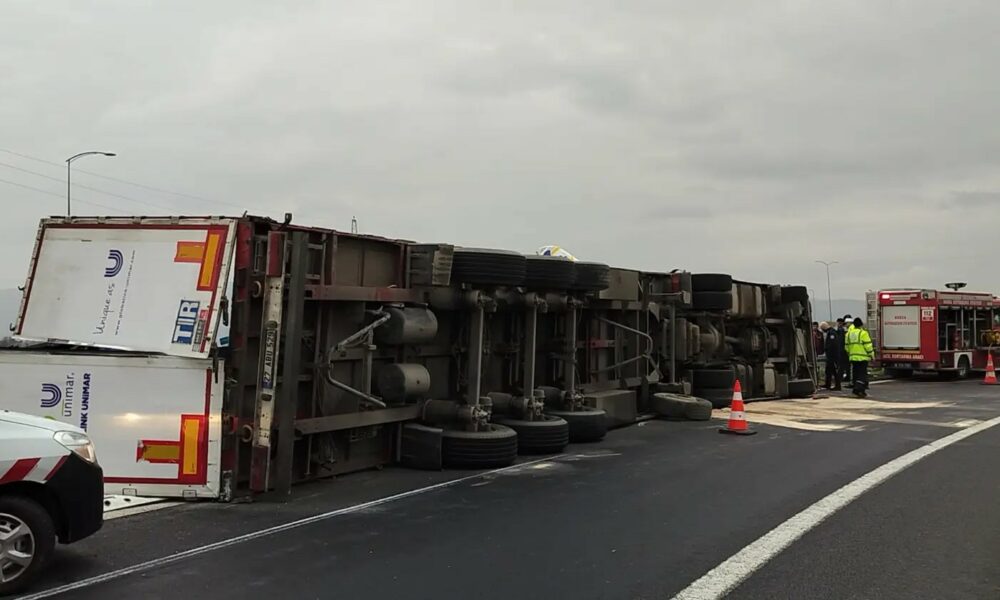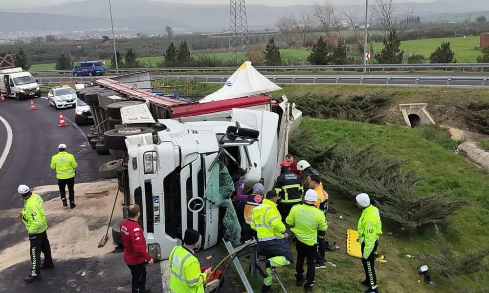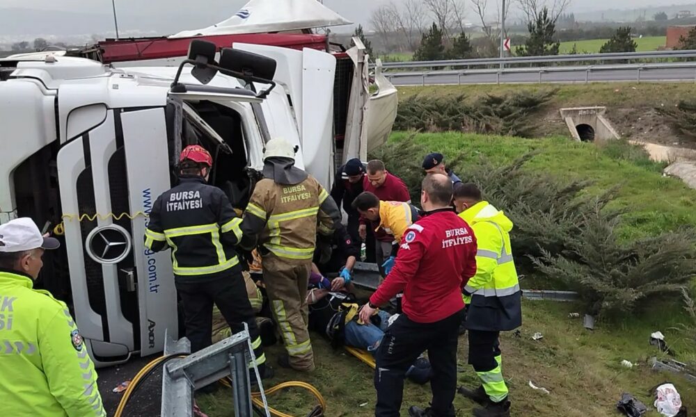 BURSA’nın Orhangazi ilçesinde, devrilen TIR’da sıkışan sürücü Fikret Deniz (34), itfaiye ekiplerince 1 saatlik çalışmanın ardından kurtarılarak hastaneye sevk edildi. Kaza saat 16.00 sıralarında Gebze-Orhangazi-İzmir otoyolu Orhangazi kavşağında meydana geldi. Fikret Deniz  idaresindeki 47 DS 786 plakalı, rulo plastik kapı fitili yüklü TIR, virajda sürücüsünün kontrolünden çıkarak devrildi. Deniz, TIR içinde sıkışırken, ihbarla olay yerine itfaiye ve sağlık ekipleri sevk edildi. İtfaiye ekiplerinin 1 saat süren çalışmasıyla sıkıştığı yerden çıkarılan yaralı sürücü, ilk müdahalesinin ardından ambulansla kaldırıldığı Orhangazi Devlet Hastanesi’nde tedaviye alındı. Kaza nedeniyle otoban kavşağında trafik kontrollü olarak sağlanırken, jandarma, kazayla ilgili soruşturma başlattı.