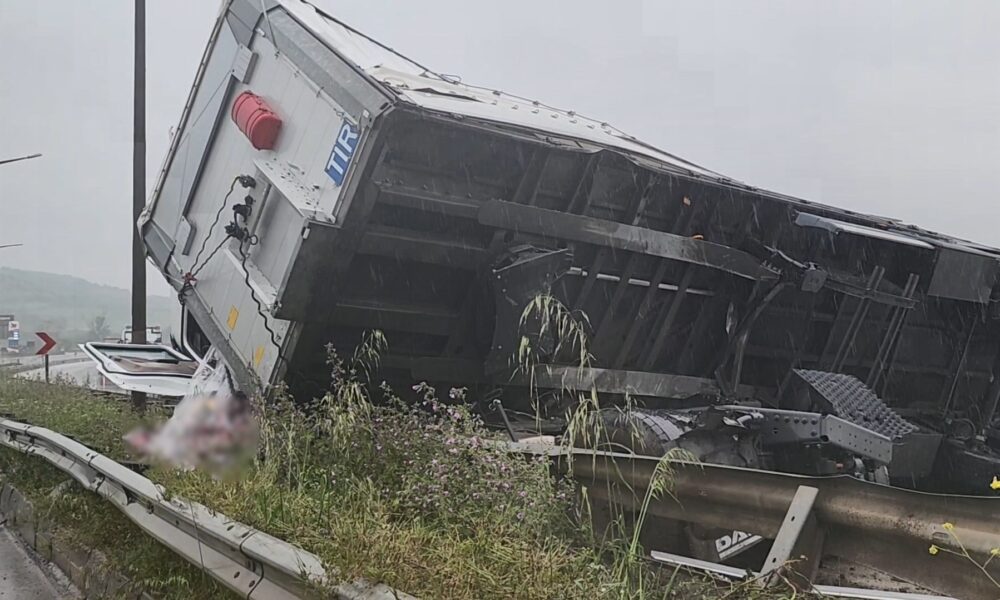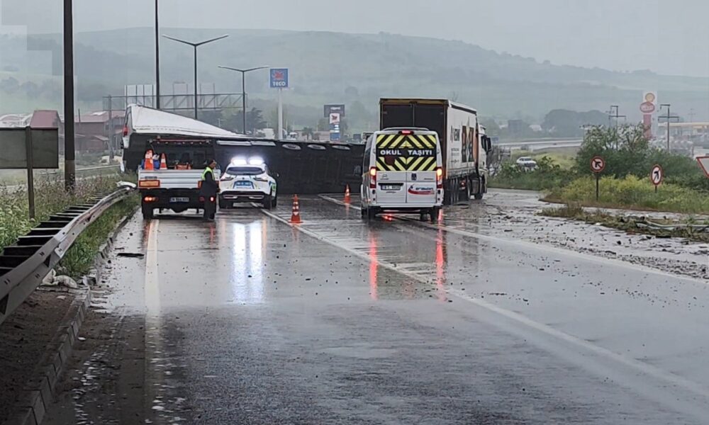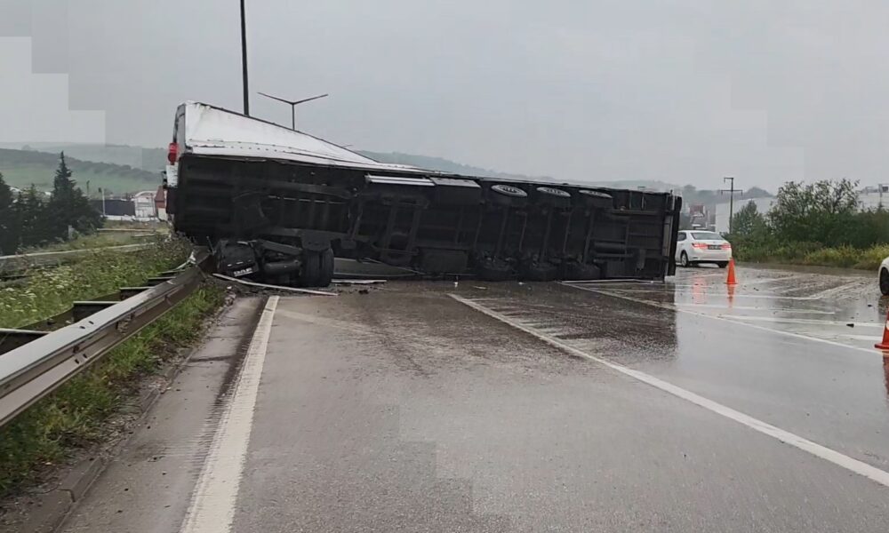 Kaza, saat 07.00 sıralarında Mustafakemalpaşa ilçesi Terminal Kavşağında meydana geldi. Bursa yönüne giden H.B. yönetimindeki içki kutusu yüklü TIR, iddiaya göre yağmur nedeniyle kayganlaşan yolda kontrolden çıkarak bariyerlere çarpıp, devrildi. Kazada, dorsesinde içki kutuları yola saçıldı. İhbarla olay yerine polis ve sağlık ekipleri sevk edildi. Yolda güvenlik önlemi alan polis ekipleri, trafiği kontrollü olarak sağlarken, sürücü H.B. kazadan yara almadan kurtuldu.