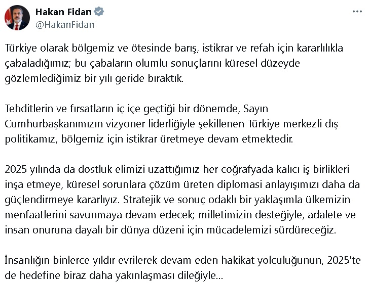 Bakan Fidan, sosyal medya hesabından yaptığı açıklamada, “Türkiye olarak bölgemiz ve ötesinde barış, istikrar ve refah için kararlılıkla çabaladığımız; bu çabaların olumlu sonuçlarını küresel düzeyde gözlemlediğimiz bir yılı geride bıraktık. Tehditlerin ve fırsatların iç içe geçtiği bir dönemde, Sayın Cumhurbaşkanımızın vizyoner liderliğiyle şekillenen Türkiye merkezli dış politikamız, bölgemiz için istikrar üretmeye devam etmektedir. 2025 yılında da dostluk elimizi uzattığımız her coğrafyada kalıcı iş birlikleri inşa etmeye, küresel sorunlara çözüm üreten diplomasi anlayışımızı daha da güçlendirmeye kararlıyız. Stratejik ve sonuç odaklı bir yaklaşımla ülkemizin menfaatlerini savunmaya devam edecek; milletimizin desteğiyle, adalete ve insan onuruna dayalı bir dünya düzeni için mücadelemizi sürdüreceğiz. İnsanlığın binlerce yıldır evrilerek devam eden hakikat yolculuğunun, 2025’te de hedefine biraz daha yakınlaşması dileğiyle” ifadelerini kullandı.