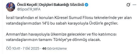 Dışişleri Sözcüsü Öncü Keçeli, Sumud Filosuna gerçekleştirilen müdahale sonrası alıkonulan Türk vatandaşlarının tahliyesine ilişkin, sosyal medya hesabından açıklama yaptı. Keçeli, “İsrail tarafından el konulan Küresel Sumud Filosu teknelerinde yer alan vatandaşlarımızdan 14ü bu sabah kara yoluyla Ürdüne geçtiler. Ammandan hava yoluyla ülkemize gelecekler ve filo katılımcısı vatandaşlarımızın tamamı Türkiyeye dönmüş olacak” ifadelerini kullandı.