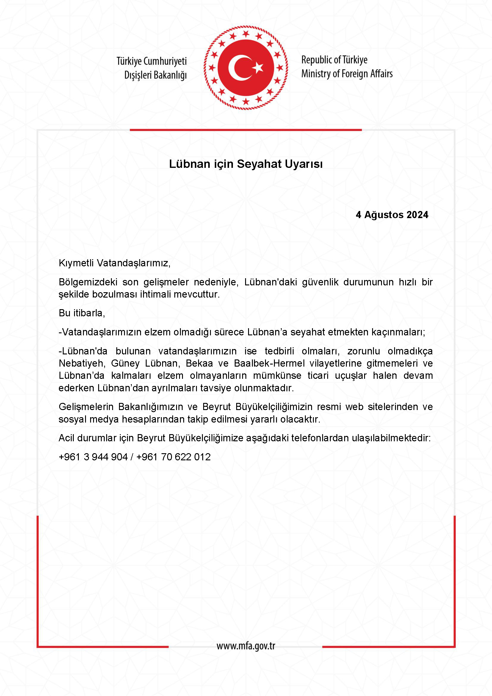 Dışişleri Bakanlığı, sosyal medya hesabı X ten yaptığı açıklamada, “Kıymetli Vatandaşlarımız, Bölgemizdeki son gelişmeler nedeniyle, Lübnandaki güvenlik durumunun hızlı bir şekilde bozulması ihtimali mevcuttur. Bu itibarla, Vatandaşlarımızın elzem olmadığı sürece Lübnan’a seyahat etmekten kaçınmaları; Lübnanda bulunan vatandaşlarımızın ise tedbirli olmaları, zorunlu olmadıkça Nebatiyeh, Güney Lübnan, Bekaa ve Baalbek-Hermel vilayetlerine gitmemeleri ve Lübnan’da kalmaları elzem olmayanların mümkünse ticari uçuşlar halen devam ederken Lübnan’dan ayrılmaları tavsiye olunmaktadır. Gelişmelerin Bakanlığımızın ve Beyrut Büyükelçiliğimizin resmi web sitelerinden ve sosyal medya hesaplarından takip edilmesi yararlı olacaktır” ifadeleri kullanıldı.