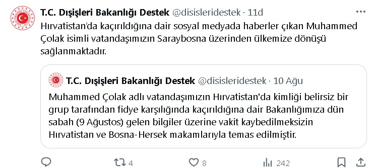 Bakanlığın sosyal medya hesabından yapılan açıklamada, “Hırvatistan’da kaçırıldığına dair sosyal medyada haberler çıkan Muhammed Çolak isimli vatandaşımızın Saraybosna üzerinden ülkemize dönüşü sağlanmaktadır” denildi.
