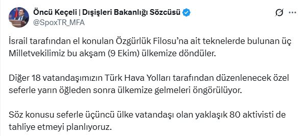 Dışişleri Bakanlığı Sözcüsü Keçeli, Özgürlük Filosuna gerçekleştirilen müdahale sonrası alıkonulan Türk vatandaşlarının tahliyesine ilişkin, sosyal medya hesabından açıklama yaptı. Keçeli, “İsrail tarafından el konulan Özgürlük Filosu’na ait teknelerde bulunan üç Milletvekilimiz bu akşam (9 Ekim) ülkemize döndüler. Diğer 18 vatandaşımızın Türk Hava Yolları tarafından düzenlenecek özel seferle yarın öğleden sonra ülkemize gelmeleri öngörülüyor. Söz konusu seferle üçüncü ülke vatandaşı olan yaklaşık 80 aktivisti de tahliye etmeyi planlıyoruz” ifadelerini kullandı.