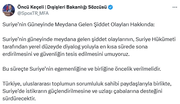 Sözcü Keçeli, sosyal medya hesabı üzerinden yaptığı açıklamada, “Suriye’nin güneyinde meydana gelen şiddet olaylarının, Suriye Hükümeti tarafından yerel düzeyde diyalog yoluyla en kısa sürede sona erdirilmesini ve güvenliğin tesis edilmesini umuyoruz. Bu süreçte Suriye’nin egemenliğine ve birliğine öncelik verilmelidir. Türkiye, uluslararası toplumun sorumluluk sahibi paydaşlarıyla birlikte, Suriye’de istikrarın güçlendirilmesine ve uzlaşı çabalarına desteğini sürdürecektir” ifadelerini kullandı.