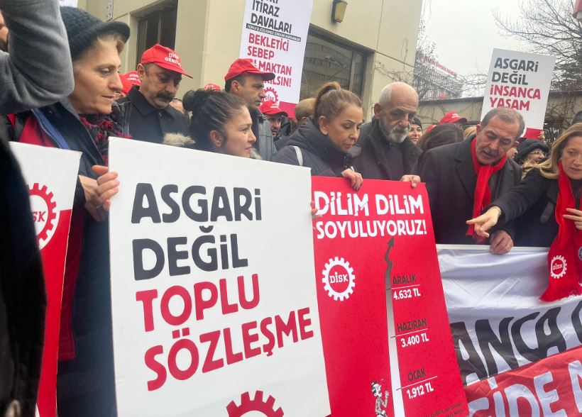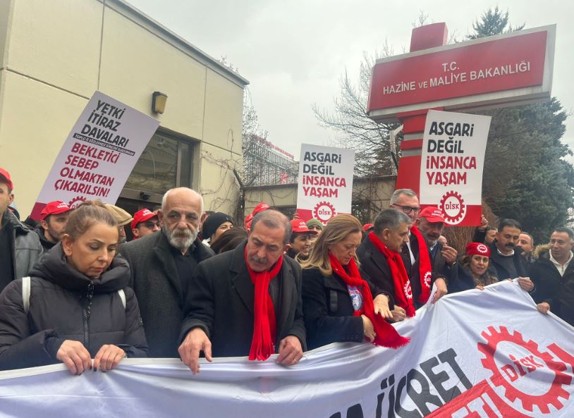DİSK üyeleri, Hazine ve Maliye Bakanlığı önünde toplandı. Toplanan kalabalık, Hak, hukuk, adalet, Sermayeye değil emekliye bütçe ve Asgari değil, insanca yaşam sloganları attı. Grup ayrıca İnsanca ücret vergide adalet, Teşmil mekanizması uygulansın pankartları açtı. Topluluk adına konuşan DİSK Genel Başkanı Arzu Çerkezoğlu, “İki yılı aşkın bir süredir Gelirde adalet, vergide adalet diyoruz. Çünkü bu ülkede işçiler, emekçiler, emekliler bu ülkenin tüm değerlerini ve güzelliklerini üretenler olarak ürettiğimiz değerden payımızı alamıyoruz. Her gün bu yüksek enflasyon ve hayat pahalılığı karşısında daha yoksullaşıyoruz. Alım gücümüz her gün daha fazla eriyor. İşçiler olarak bir ortalama ücret haline gelen asgari ücrete mahkum edildik. Bir ortalama ücret olan sembolik bir ücret olmayan asgari ücret, milyonların geçinmekle yüz yüze bırakıldığı asgari ücret, 2025 yılı için asgari ücret, birkaç gün önce belirlendi biliyorsunuz. Tümüyle göstermelik ve ciddiyetten uzak bir biçimde, işçi tarafının olmadığı, 50 yıl sonra ilk kez bir gece yarısı toplantısıyla belirlendi asgari ücret. Ve biz biliyoruz ki bu asgari ücreti hükümet yerli ve yabancı sermaye temsilcilerinin taleplerine göre belirledi” ifadelerini kullandı.