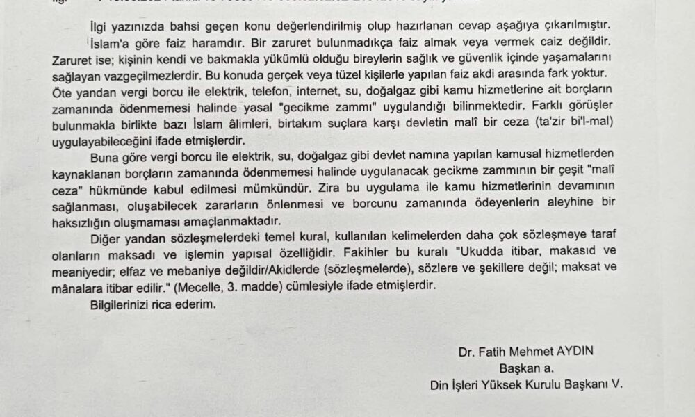 “İslama göre faiz haramdır. Bu zaruret bulunmadıkça faiz almak veya vermek caiz değildir. Zaruret ise, kişinin kendi ve bakmakla yükümlü olduğu bireylerin sağlık ve güvenlik içinde yaşamalarını sağlayan vazgeçilmezlerdir. Bu konuda gerçek veya tüzel kişilerde yapılan faiz akdi arasında fark yoktur. Öte yandan vergi borcu ile elektrik, telefon, su, doğal gaz gibi kamu hizmetlerine ait borçların zamanında ödenmemesi halinde yasal gecikme zammı uygulandığı bilinmektedir. Farklı görüşler bulunmakla birlikte bazı İslam alimleri, birtakım suçlara karşı devletin mali bir ceza uygulayabileceğini ifade etmişlerdir. Buna göre vergi borcu ile elektrik, su, doğal gaz gibi devlet namına yapılan kamusal hizmetlerden kaynaklanan borçların zamanında ödenmemesi halinde uygulanacak gecikme zammının bir çeşit mali ceza hükmünde kabul edilmesi mümkündür. Zira bu uygulama ile kamu hizmetlerinin devamının sağlanması, oluşabilecek zararların önlenmesi ve borcunu zamanında ödeyenlerin aleyhine bir haksızlığın oluşmaması amaçlanmaktadır.”