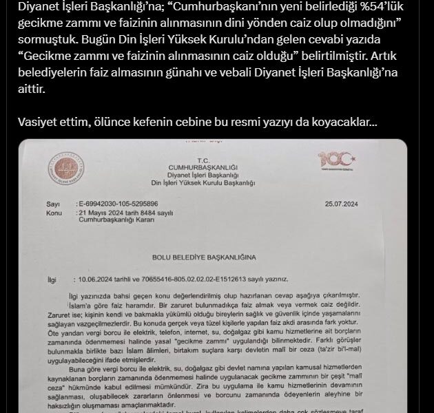 Başkan Özcan, Diyanetin cevabını sosyal medya hesabından paylaşarak, “Diyanet İşleri Başkanlığına Cumhurbaşkanının yeni belirlediği yüzde 54lük gecikme zammı ve faizinin alınmasının dini yönden caiz olup olmadığını sormuştuk. Bugün Din İşleri Yüksek Kurulundan gelen cevabi yazıda Gecikme zammı ve faizinin alınmasının caiz olduğu belirtilmiştir. Artık belediyelerin faiz almasının günahı ve vebali, Diyanet İşleri Başkanlığına aittir. Vasiyet ettim, ölünce kefenin cebine bu resmi yazıyı da koyacaklar” dedi.