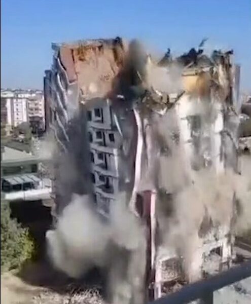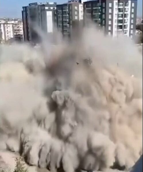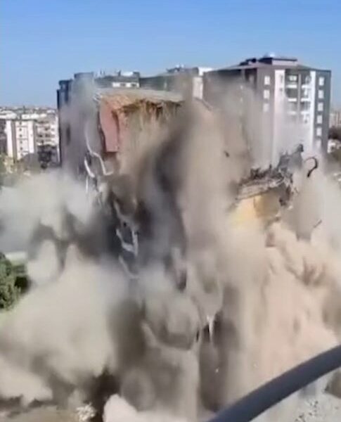 Kahramanmaraş merkezli 6 Şubat 2023teki depremlerde ağır hasar aldığı için tahliye edilen Kayapınar ilçesi Diclekent Mahallesi’ndeki 11 katlı bina, kontrollü yıkım sırasında çöktü. Çökmeyle çevreyi toz bulutu kaplarken, o anlar cep telefonu kamerasıyla kaydedildi. Binanın enkazının kaldırılması için çalışma başlatıldı.