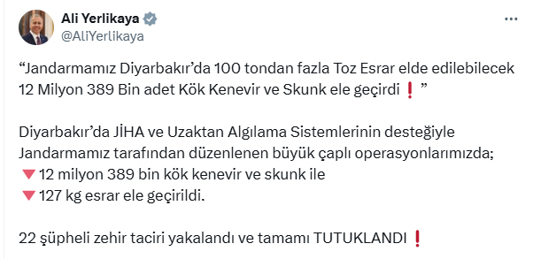 İçişleri Bakanı Ali Yerlikaya, Diyarbakırın Lice ilçesinde jandarma tarafından düzenlenen narkotik operasyonunu sosyal medya hesabından paylaştı. Buna göre; 143 operasyonel tim ve 1780 personelin katıldığı operasyonda, 1 S-70 genel maksat helikopteri, 1 ATAK taarruz helikopteri, 2 Jandarma İHA ve uzaktan algılama sistemleri kullanıldı. Arazide yapılan arama-tarama faaliyetleri sonucunda 100 tondan fazla toz esrar elde edilebilecek 12 milyon 389 bin kök kenevir ve skunk ile 127 kilogram esrar ele geçirildi. 22 şüpheli yakalanırken, şüphelilerin tamamı çıkarıldıkları hakimliklerce tutuklandı. DHA)