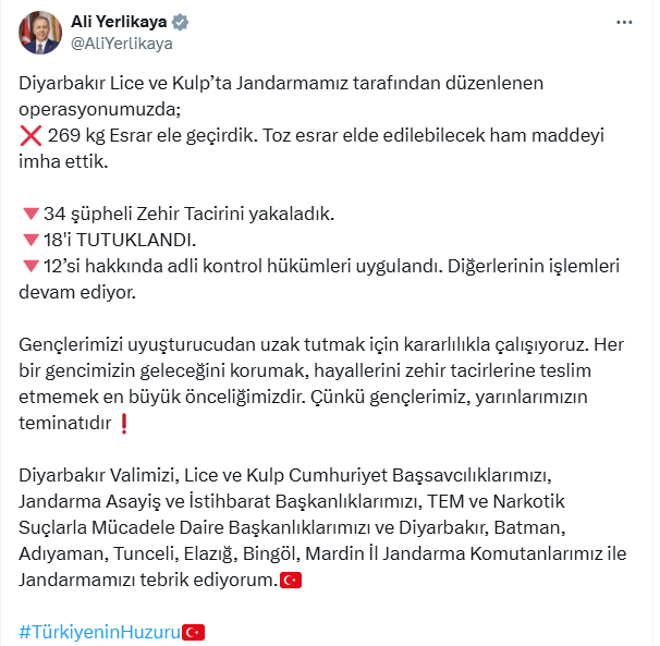 İçişleri Bakanı Ali Yerlikaya, Diyarbakırın Lice ve Kulp ilçelerinde jandarma tarafından düzenlenen narkotik operasyonunu sosyal medya hesabından paylaştı. Buna göre; 269 kilogram esrar ele geçirilirken, toz esrar elde edilebilecek ham madde imha edildi. Operasyonda 34 şüpheli yakalandı. Şüphelilerden 18i tutuklandı, 12si hakkında adli kontrol tedbiri uygulandı, diğerlerinin işlemleri devam ediyor.